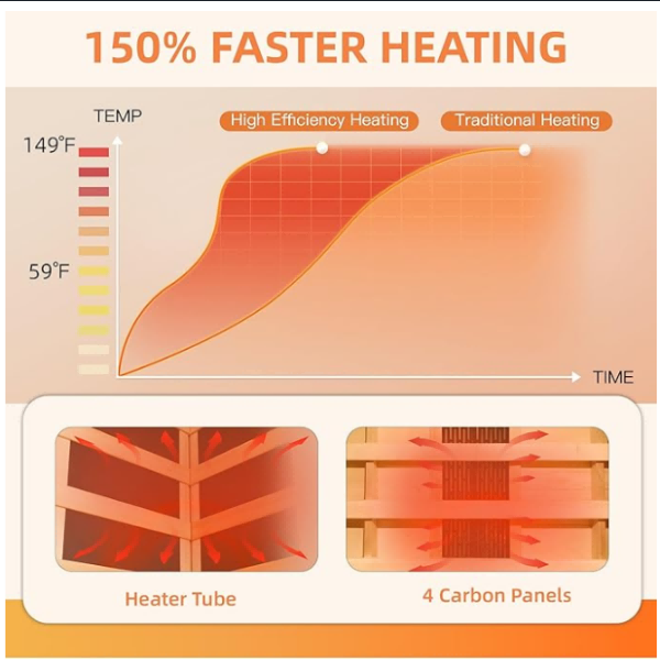 The कार्यक्षम हीटिंग तंत्रज्ञान carbon 4 कार्बन पॅनेल्स आणि 1 कार्बन ट्यूबसह सुसज्ज, आमची 1 व्यक्ती इन्फ्रारेड सॉना 360-डिग्री सभोवतालची उष्णता प्रदान करते, अगदी उष्णतेचे वितरण देखील सुनिश्चित करते. थोडक्यात, ते फक्त 10-15 मिनिटांत गरम होते, ज्यामुळे आपल्याला उशीर न करता आपल्या सौनाच्या अनुभवाचा आनंद मिळू शकेल.
