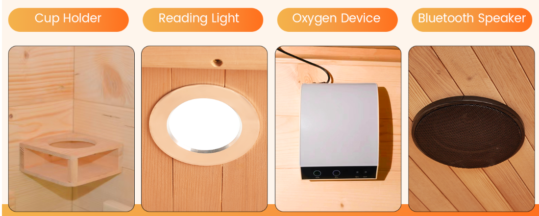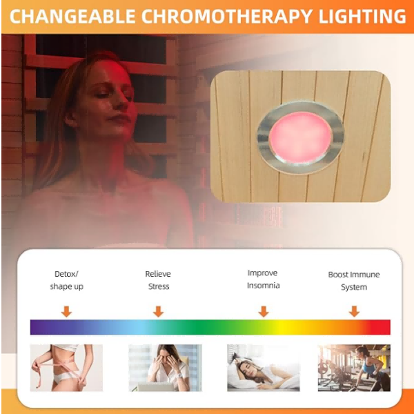 【वर्धित विश्रांती home घरासाठी आमच्या इन्फ्रारेड सौनामध्ये 7 कलर लाइट थेरपीसह एक छप्पर प्रकाशित केली गेली आहे, ज्यामुळे आपला एकूण अनुभव वाढविण्यासाठी एक विसर्जित वातावरण तयार होते. हे आपल्या तळघर, स्नानगृह किंवा जिममध्ये सहज स्थापित केले जाऊ शकते आणि ब्लूटूथ कनेक्टिव्हिटी आणि ऑक्सिजन बारसह आपण आरामशीर सौना सत्राचा आनंद घेऊ शकता