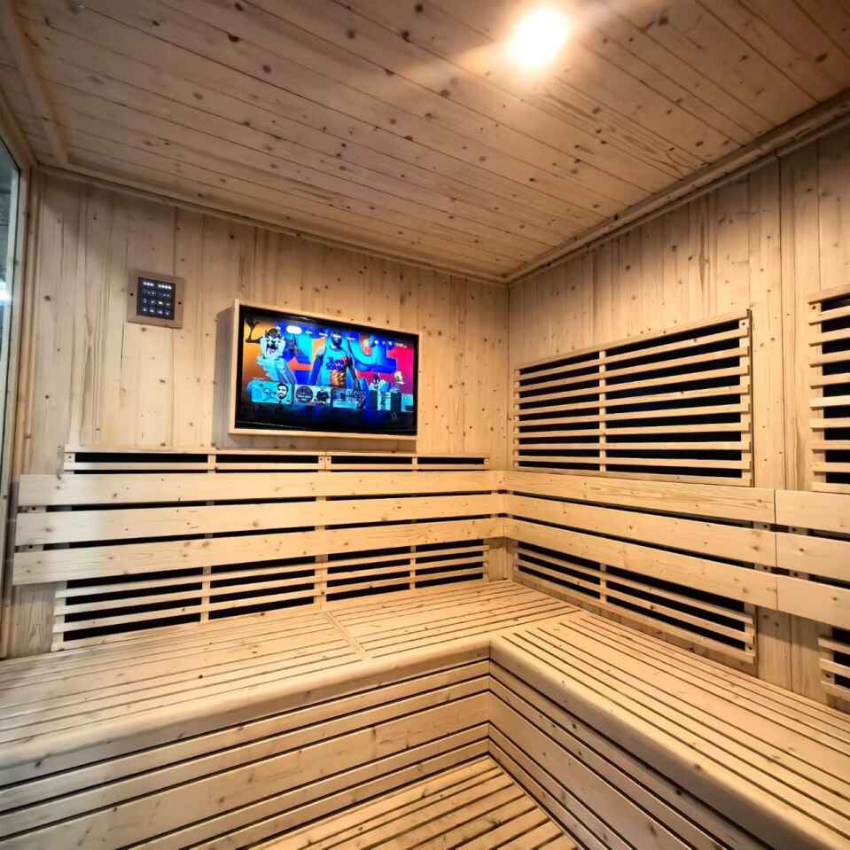 अंगभूत एलसीडी टीव्ही (प्रतिमेमध्ये दृश्यमान) सौनाचा अनुभव बदलतो: