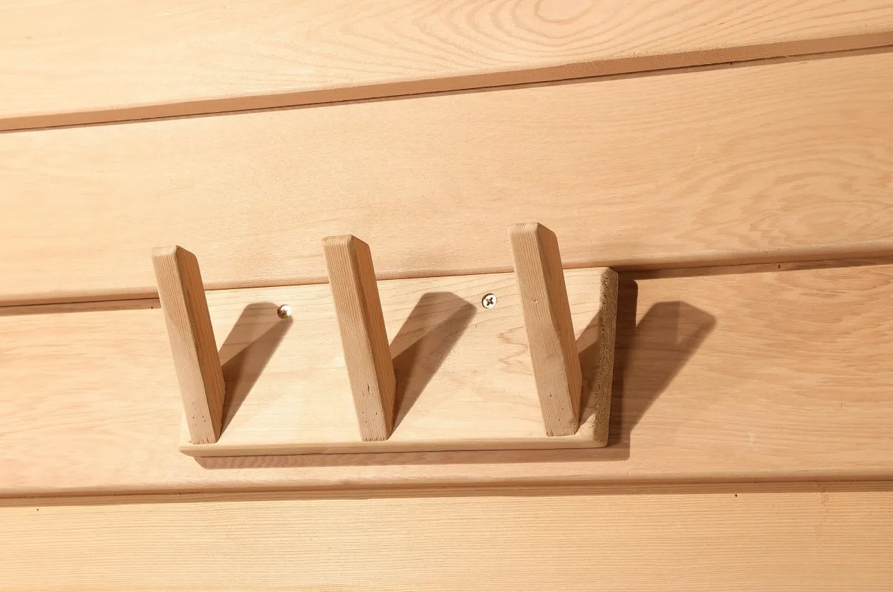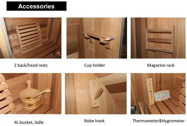 - सोयीचे सामान: कप होल्डर, मॅगझिन रॅक, अंगभूत कपड्यांचे हॅन्गर (कपडे आणि टॉवेल्स अनौपचारिकपणे साठवण्यासाठी, सौना सत्रांमध्ये गोंधळ दूर करण्यासाठी);
