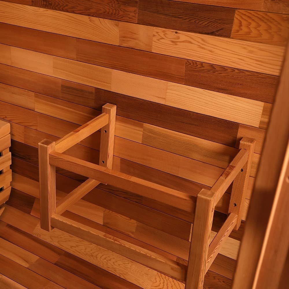 - मुख्य सामग्री: उच्च-गुणवत्तेचे उष्णता-प्रतिरोधक घन लाकूड सर्वत्र वापरले जाते (भिंती, बेंच आणि फ्रेम सर्व घन लाकूड आहेत), उच्च-तापमान आणि उच्च-आर्द्रता सॉना वातावरणाशी जुळवून घेण्यासाठी ओलावा आणि उष्णता प्रतिरोधकतेसाठी व्यावसायिक उपचार केले जातात.