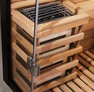 स्टेडी स्टीमसाठी सॉना हीटर: समाविष्ट सॉना हीटर सातत्यपूर्ण, सौम्य वाफ देते—एकट्या वापरासाठी आदर्श, कारण ते लवकर गरम होते (दीर्घकाळ प्रतीक्षा करत नाही) आणि स्थिर तापमान राखते (अंगभूत थर्मामीटरद्वारे निरीक्षण केले जाते).
