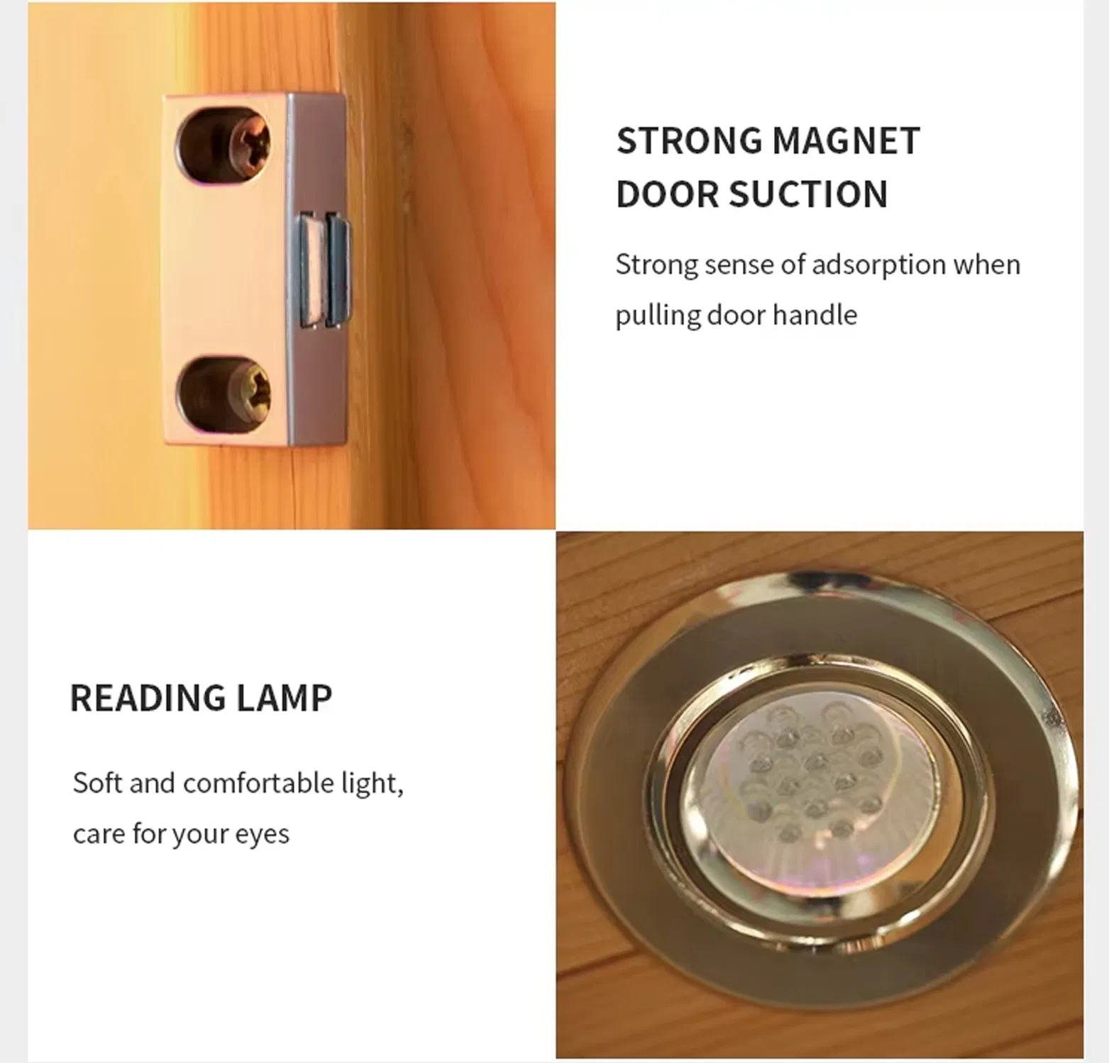 - मॅग्नेटिक डोअर कॅच- उष्णतेमध्ये लॉक करण्यासाठी आणि ड्राफ्ट बाहेर ठेवण्यासाठी स्नॅप्स शांतपणे बंद होतात. आणखी स्लॅमिंग दरवाजे किंवा तापमान कमी होणार नाही.
